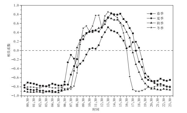 晴好天气下, 不同季节的SVF与UHII线性相关系数随时间变化如图 3所示。由图 3可知,不同季节SVF与UHII线性关系随时间变化相似。从日落到日出,呈显著线性负相关 (达到0.05显著性水平);日出后,SVF和UHII相关性迅速变弱,并逐渐由负相关转变为正相关。白天SVF与UHII呈线性正相关,春、秋、冬季相关系数大于夏季,且不同季节相关性最大值出现的时刻不同。