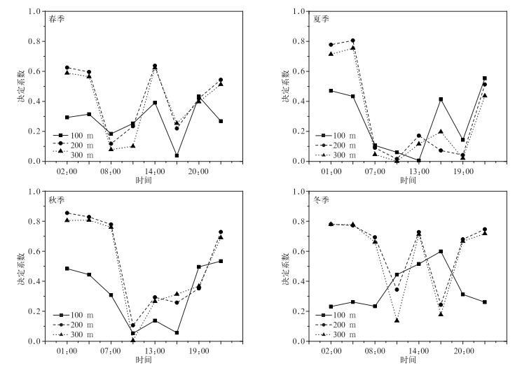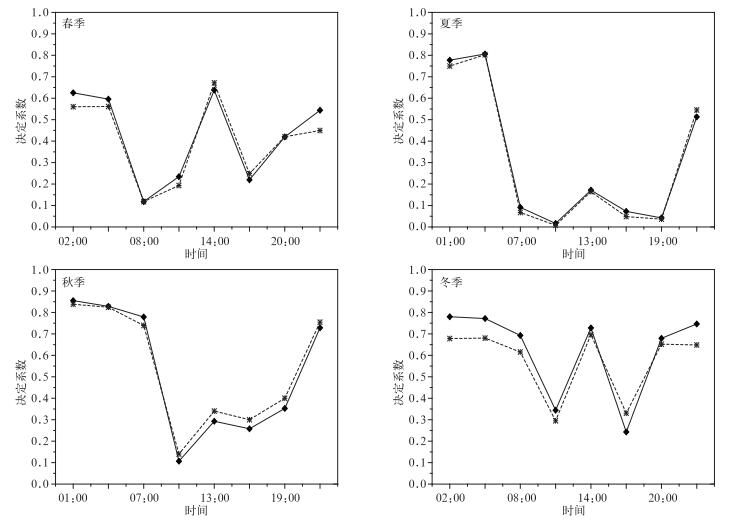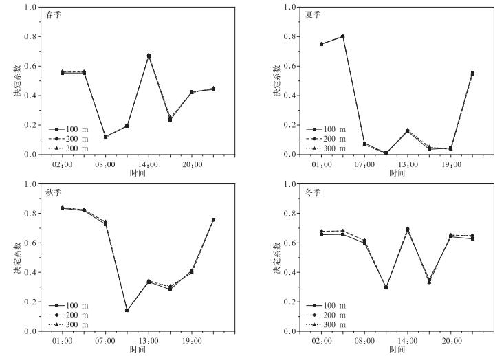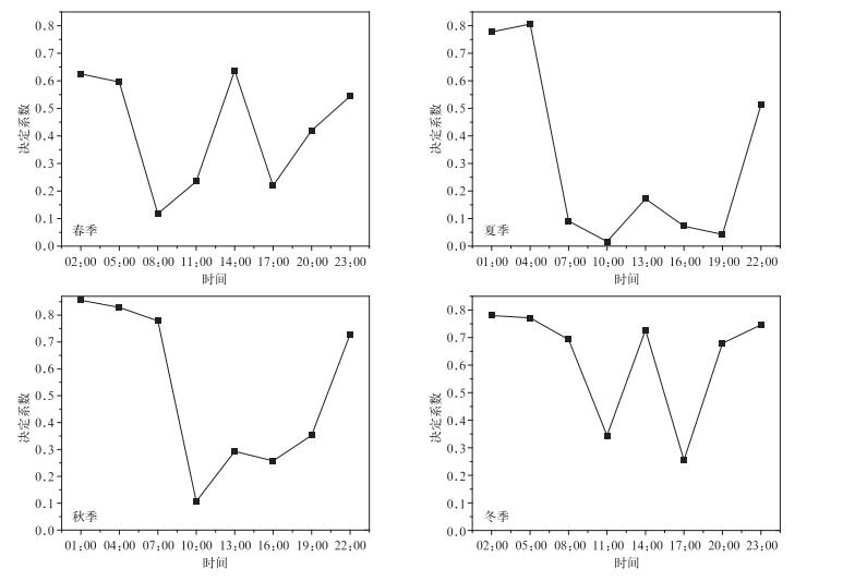 根据以上分析,夜间与早晨采用对数关系、白天采用线性关系计算出FAI与UHII在四季各个时刻的决定系数 (图 4)。由图 4可知,夏、秋、冬季的FAI与夜间热岛强度的决定系数基本上大于0.68(除夏季22:00为0.52),甚至很多时刻大于0.8,明显大于春季的FAI与UHII决定系数 (0.6左右)。四季夜间及早晨时刻FAI与UHII相关性均达到0.05显著性水平,白天除了春季14:00左右,春、夏、秋季FAI与UHII决定系数均小于0.3,线性负相关不显著,冬季决定系数比其他3个季节略高,尤其是14:00的决定系数为0.73,说明FAI与UHII在冬季午后呈显著的线性负相关。