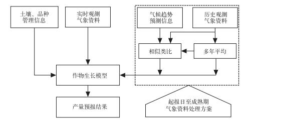 1.3 预报流程及气象资料处理方案利用作物模型开展实时产量预报的技术流程如图 1所示,运行作物模型所需的土壤、品种、田间管理信息及播种至起报日的气象资料采用预收集和实时观测输入,起报日至成熟期气象资料,采用平均值处理和历史相似类比两种方案获取。平均值处理方案假定对起报日后期气候趋势无先验认识,采用当地多年逐日平均值替代,通常反映一个地区的气候稳定性需要30年资料作为基准,考虑到气候要素可能存在年代际变化,本文分别采用近30年、10年和5年平均。历史相似类比方案为避免多年逐日平均处理对气候要素季节内波动和时间分布特征造成的破坏,以当年起报日至成熟期气候趋势为基准,以研究区域内气候条件基本相近的多站点历史观测资料为参比库,从中选取与基准值接近的“真实”气象资料序列,作为起报日后期逐日气象资料。在实时业务中,起报日后期气候趋势可通过月、季尺度气候预测获取,在对起报日后期气候趋势无先验认识的情况下,可采用多年平均值作为基准值。为比较相似类比和平均值处理方案对产量预报效果的影响,分别以近30年、10年和5年平均值作为起报日后期气候趋势的基准值进行相似类比处理,作为与平均值处理方案的平行方案,同时为检验相似类比方案反映后期气候趋势的能力,以历年起报日至成熟期气候要素平均值为基准值进行相似类比替代实际气象资料进行回代检验,由此共产生7类处理方案 (表 1)。