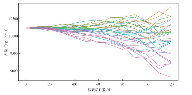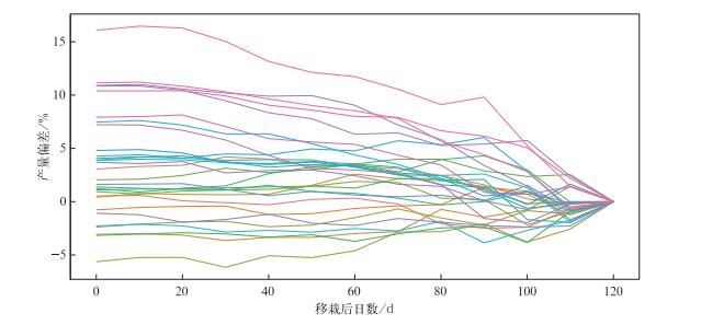 | 图 2. 1981—2010年不同起报时间模拟的最终产量 (不同颜色曲线代表1981—2010年不同年份的模拟结果,下同) Fig 2. Simulated final yield at different forecast day for 1981-2010 (different color represents result of different year) | |