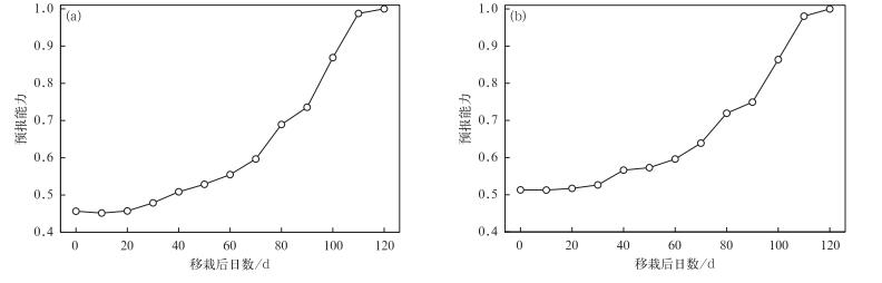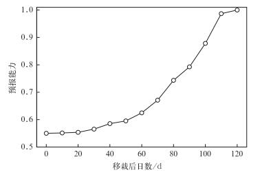 图 3为不同起报时间预测的产量与当年实际气象资料模拟的产量偏差,由图 3可知,区域平均的预测产量偏差在-5%~15%之间,随着起报时间的推迟,预测偏差逐渐缩小,其中在移栽50 d后预测偏差开始明显缩小。以±5%为临界误差 (95%置信水平),统计不同起报时间产量预测误差在临界误差范围内的概率见图 4。由图 4可知,自移栽之日起50 d内,预测概率在0.5~0.6之间缓慢上升,50 d后迅速上升,90 d时达到0.8,100 d时达到0.9,表明在成熟前10~60 d,基于30年气候平均值开展产量预报具有一定的预报技巧,但仍存在预报误差。