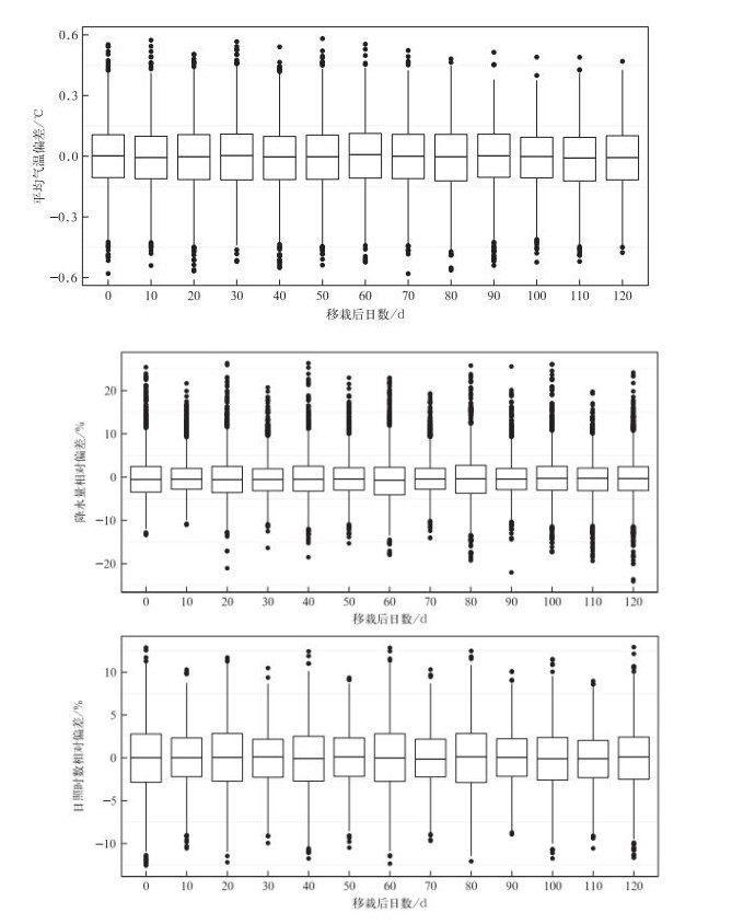 以1981—2010年历年水稻播种至成熟期实际气象观测资料为基准,通过相似类比从历史参比库中获取相近的样本进行替换,统计替代资料与基准资料的偏差如图 9所示。由图 9可知,通过相似类比获取的替代资料与基准值的偏差接近于0,25%和75%分位数对应的平均气温偏差为-0.12~0.11℃,降水量相对偏差为-4.0%~2.8%,日照时数相对偏差为-2.9%~2.9%,且不同起报时间下误差分布较稳定,表明基于气候相似类比的方法获取逐日替代资料具有一定的可行性。