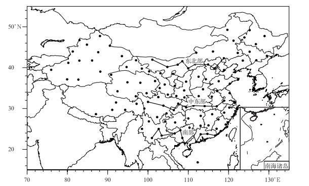 1 资料与方法 1.1 资料研究表明,高时空分辨率的资料能够更加清楚地揭示出对流层顶的细致结构[14]。本文所用资料为中国气象局气象探测中心提供的L波段探空资料。L波段高空探测系统是我国自行研制的高空气象探测系统,于2007年1月开始统一编报上传并存储[29],至2008年全国共有85个探空站,2009—2010年共增加34个,至2011年5月达到120个。探测气球在上升的过程中每秒采集1组数据,生成1个观测记录,具有极高的垂直分辨率,在对流层顶附近的垂直分辨率约为10 m。本文所使用的资料时间段为2008—2014年,每日两个观测时次,共120个站,分布如图 1所示。图 1中由北至南的3条黑线分别代表中国东北部、中东部和南部区域。