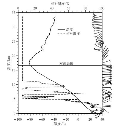 1.2 方法本研究使用WMO[1]给出的定义计算第一对流层顶 (下文简称对流层顶),即温度递减率减至2℃/km或以下的最低高度,并在此高度至其上2 km内任一高度范围内的平均温度递减率不超过2℃/km。为避免近地面扰动和逆温层的影响,选用地面6 km以上的数据计算对流层顶。图 2为2014年5月1日20:00(北京时,下同) 海南省三亚探空廓线,按照上述计算过程得到的对流层顶由粗实线标出。可以看出,在对流层温度随着高度递减,对流层顶以上,有一段等温层,之后温度随高度递增;水平风场在近地面以上至对流层顶为一致的东风,在对流层顶附近开始转变为东北风,向上逐渐转为西风;而相对湿度在对流层低层 (5 km以下) 可达80%以上,随着高度上升,相对湿度急速减小,在对流层顶以下已减小到5%,并随着高度增长不再变化,这是由于湿度传感器在低温时探测偏干,探测性能下降[31-32]。