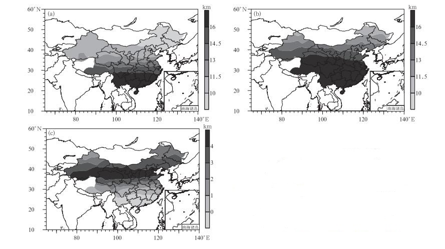 表 1 中国东北部、中东部和南部的对流层顶高度特征 Table 1 Tropopause height over northeast China, central-east China and southern China |