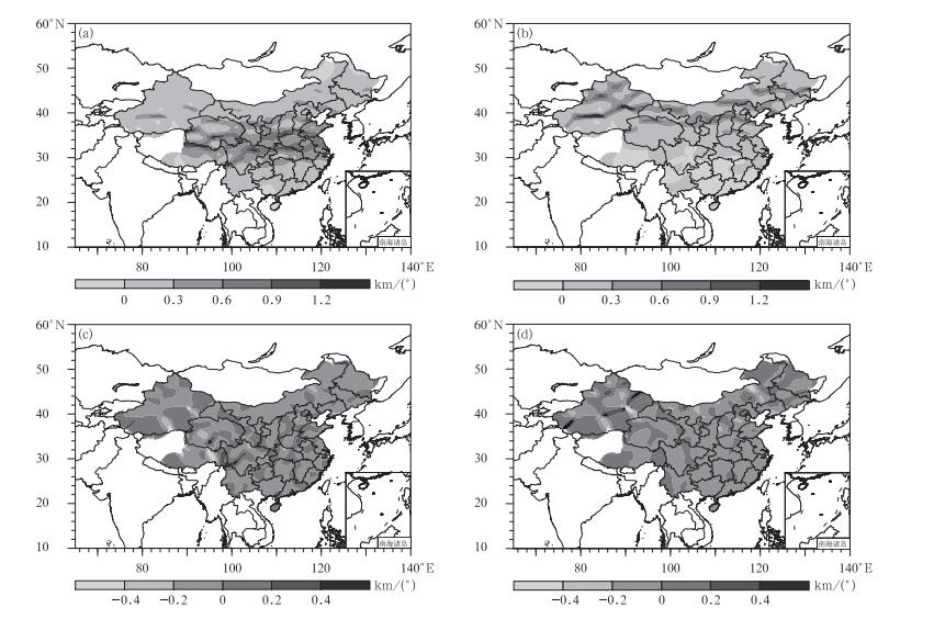 图 4为夏季风爆发前后的对流层顶高度梯度分布 (经向梯度以向南为正,纬向梯度以向东为正)。在夏季风爆发前,全国对流层顶高度向南递增,递增幅度大值区在30°~40°N之间,最大值为1.2 km/(°) 以上 (图 4a)。夏季风爆发后,经向递增幅度大值区北移至40°~50°N,最大值位于塔里木盆地和吐鲁番盆地的南侧,此处地形差异较大 (图 4b)。而长江流域以南和青藏高原南部的对流层顶高度则向南略微减小,减小幅度约-0.1 km/(°)。图 4c、图 4d反映了对流层顶高度的纬向梯度,可以看到,纬向梯度虽不像经向梯度一样随纬度 (经度) 单一变化,但类似的是,夏季风爆发后纬向梯度大值区也由中部地区北移至北部地区。