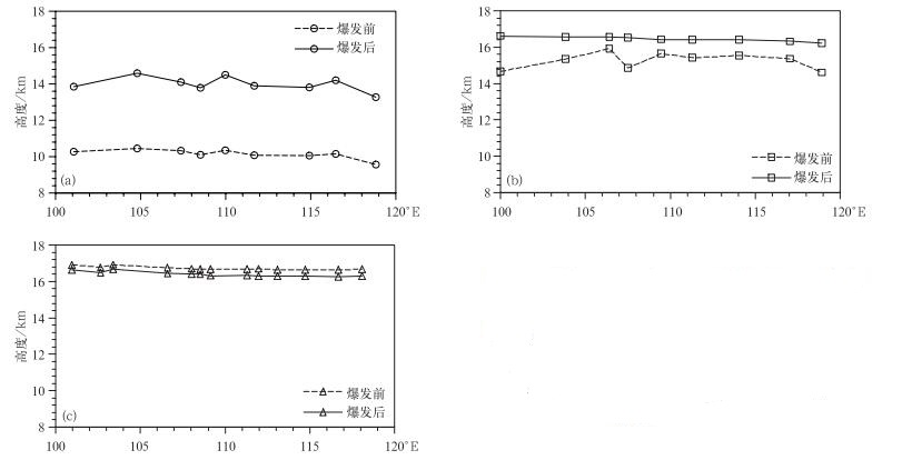 图 5为代表中国东北部、中东部和南部的3条纬度带上的站点在夏季风爆发前后的对流层顶高度分布图。南部的平均对流层顶最高,中东部地区次之,东北部最低,3个区域的对流层顶高度东西向差异 (即不同地形间的差异) 较小,与表 1的结果一致。东北部地区的对流层顶高度在夏季风爆发前后变化明显,夏季风爆发后,对流层顶高度上升至14 km左右 (图 5a),而中东部地区上升幅度较小 (约2 km)(图 5b),南部地区基本无变化,甚至有所下降 (图 5c)。此外,在夏季风爆发前,东北部地区的对流层顶高度在不同经度上差异很小,而在夏季风爆发后,不同经度间的差异增大,这可能是由于夏季风爆发后,对流层顶高度大幅上升,不同纬度间差异明显,而实际选择站点构成代表东北部的纬度带时不能做到完全同一纬度。不同的是,中东部地区各站点的对流层顶在夏季风爆发后不同经度间的差别减小。