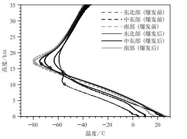 东亚夏季风爆发前后3条纬度带上的站点平均的大气温度廓线如图 6所示。夏季风爆发前,东北部地区的温度廓线呈双峰结构,通常存在双对流层顶,根据WMO定义得到的对流层顶高度位于较低位置的峰值以下 (10 km左右),即为第一对流层顶[36];夏季风爆发后,大气中低层加热,双峰结构消失,对流层顶高度向上抬升至14 km左右。除南部地区外,在夏季风爆发后,对流层和平流层的大气温度均有所上升,而在对流层-平流层过渡区域的大气温度则有所下降,对应对流层顶高度上升;而南部地区在夏季风爆发后整层大气温度均上升,对应对流层顶高度下降。这是因为对流层中低层温度升高和对流层-平流层过渡区域温度下降导致上下温度差增大,大气温度梯度增大,符合某一高度的温度递减率减至2℃/km或以下,且在此高度至其上2 km内任何一个高度范围内的平均温度递减率不超过2℃/km的标准的高度将更高,即对流层顶高度升高,所以中东部和东北部地区的对流层顶高度在夏季风爆发后升高,而南部地区的对流层顶高度下降。