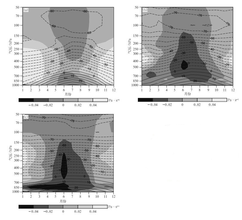 | 图 7. 不同地区的平均温度场 (等值线,单位:℃) 和平均垂直速度场 (阴影) 的年变化 (a) 中国东北部,(b) 中国中东部,(c) 中国南部 Fig 7. Annual cycle of the mean temperature (the contour, unit:℃) and vertical velocity (the shaded) of different regions (a) northeast China, (b) central-east China, (c) southern China | |