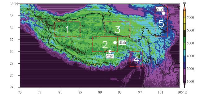 1 分析区域和数据 1.1 分析区域分析区域为高原主体区域 (24°~38°N,73°~105°E),在闪电和降水月变化关系对比研究中,选取高原上的5个不同区域 (图 1),区域1为西部 (32.5°~35°N,80°~85°E),区域2为中部 (30°~32.5°N,87.5°~92.5°E),区域3为中北部 (32.5°~35°N,90°~95°E),区域4为东南部 (27.5°~30°N,95°~97.5°E),区域5为东北部 (32.5°~37.5°N,100°~102.5°E)。这5个区域的选择分别考虑了高原的不同方位、闪电活动强度差异性、TRMM/LIS气候数据的格点 (至少对应1个数据格点)。图 1还给出了青藏高原的海拔高度分布。地形数据来自美国地理数据中心 (NGDC) 提供的分辨率为1 km×1 km的海拔高度数据集。