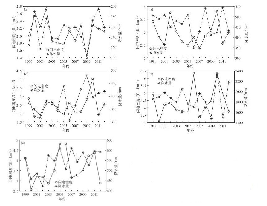 | 图 2. 青藏高原年平均闪电密度、年降水量变化 (a) 区域1,(b) 区域2,(c) 区域3,(d) 区域4,(e) 区域5 Fig 2. Annual changes of lightning density and precipitation over the Tibetan Plateau (a) region 1, (b) region 2, (c) region 3, (d) region 4, (e) region 5 | |