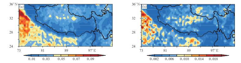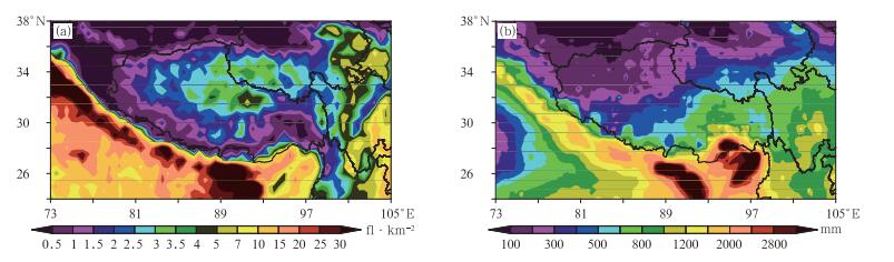 | 图 3. 青藏高原闪电密度和降水量空间分布 (a) 年平均闪电密度 (单位:fl·km-2),(b) 年降水量 (单位:mm) Fig 3. Lightning density and precipitation over the Tibetan Plateau (a) annual mean lightning density (unit:fl·km-2), (b) annual precipitation (unit:mm) | |