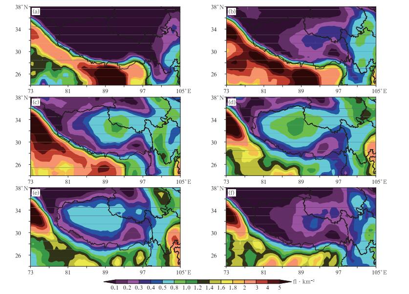 | 图 4. 青藏高原地区4月 (a)、5月 (b)、6月 (c)、7月 (d)、8月 (e)、9月 (f) 的月平均闪电密度分布 Fig 4. Monthly average lightning density over the Tibetan Plateau in Apr (a), May (b), Jun (c), Jul (d), Aug (e) and Sep (f) | |