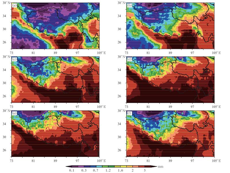 | 图 5. 青藏高原地区4月 (a)、5月 (b)、6月 (c)、7月 (d)、8月 (e)、9月 (f) 日降水量 Fig 5. Daily precipitation over the Tibetan Plateau in Apr (a), May (b), Jun (c), Jul (d), Aug (e) and Sep (f) | |