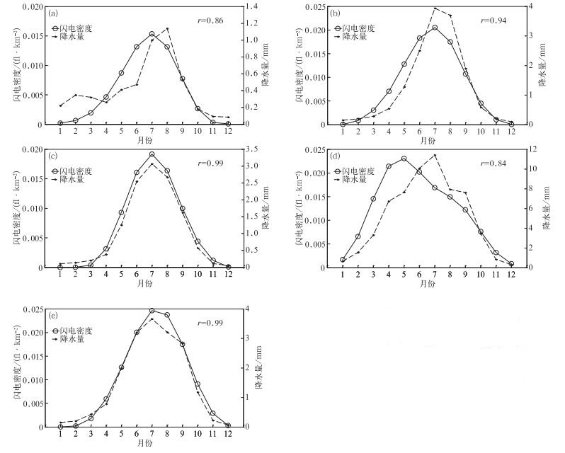 3) 对于确定地区而言,闪电、降水活动在月变化上具有较好的一致性,基本呈单峰结构,除高原西部和东南部闪电活动峰值和降水峰值出现时间不同,其他地区的闪电活动峰值均出现在7月,4—7月闪电活动和降水快速增强,随后减弱。