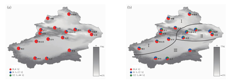 宇如聪等[1]研究表明,我国中东部降水的日循环与降水的持续性之间存在紧密联系。为探讨新疆不同区域降水日循环与降水持续性的关系,对全疆16个站不同持续时间的降水在不同时刻降水量分布进行了逐站分析,发现可根据各不同持续性降水对总降水量的贡献特征和与总降水量日变化峰值关系特征,将全疆大致归纳为3种情况:Ⅰ是短历时降水贡献显著型,Ⅱ是短和较长历时降水贡献结合型,Ⅲ是降水贡献非典型类型(各类型降水地域分布见图 7b)。