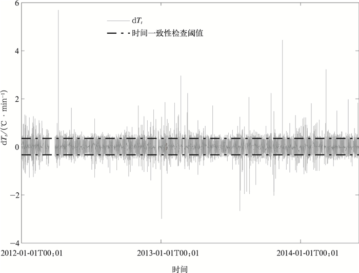 温度1 min变化值时间序列如图 1所示 (以50 m高度的数据为例)。定义温度1 min变化值超过其平均值3倍标准差的数据为疑误。