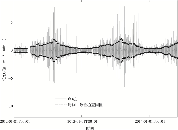 湿度1 min变化值存在显著的季节差异 (图 2,以50 m高度的数据为例)。开展时间一致性检查时采用动态阈值,即当日的阈值基于同一时间窗内 (以当天为中心,步长为15 d) 的数据确定,定义湿度1 min变化值超过其平均值4倍标准差的数据为疑误。