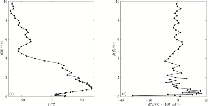 | 图3 2013年10月8日06:01温度层际变化大的疑误廓线示例 (a) 温度,(b) 相应的温度垂直变化率 Fig.3 Example of a suspected profile with excessive level-to-level fluctuations at 0601 BT 8 Oct 2013 (a) temperature, (b) corresponding temperature differences between vertical adjacent levels | |