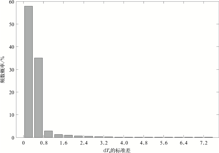 | 图4 微波辐射温度垂直变化率标准差的频数概率分布 Fig.4 Probability distribution of standard deviation of temperature differences between consecutive levels | |