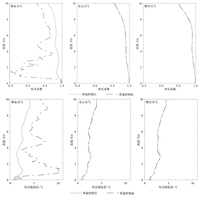 3) 质量控制后,微波辐射计探测资料的质量提高。将质量控制前后的微波辐射计资料分别与同期探空资料进行对比,结果显示:质量控制前后,0~10 km高度范围内的所有层次,两套资料的相关系数增加,均方根误差一致减少,其中,降水天气两套资料的相关系数和均方根误差变化最显著。