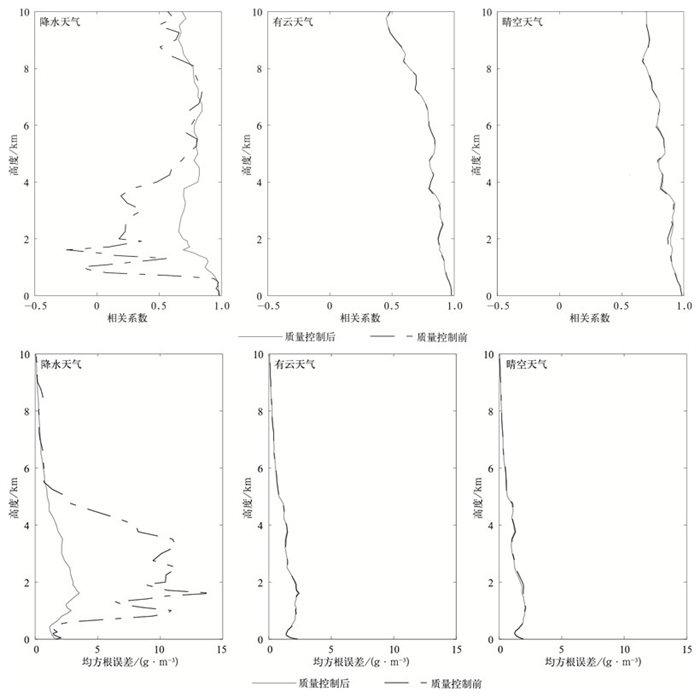 水汽密度廓线也有类似现象 (图 6)。质量控制后,降水天气各高度相关系数增大,均方根误差减少,0.5~4 km高度范围内这一变化尤其显著,相关系数和均方根误差与无降水天气的值十分接近。