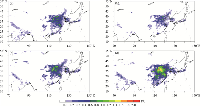 | 图1 东亚区域对流层NO2柱含量的季节分布 (a)春季, (b)夏季, (c)秋季, (d)冬季 Fig.1 Seasonal variations of tropospheric NO2 column densities over East Asia (a)spring, (b)summer, (c)autumn, (d)winter | |