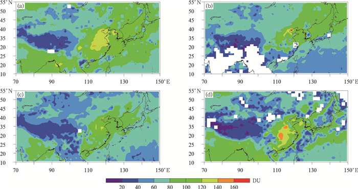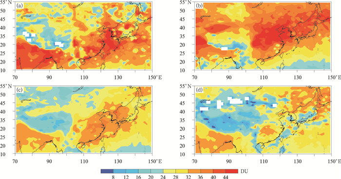 | 图3 东亚区域对流层O3柱含量的季节分布 (a)春季,(b)夏季,(c)秋季,(d)冬季 Fig.3 Seasonal variations of tropospheric ozone column densities over East Asia (a)spring, (b)summer, (c)autumn, (d)winter | |