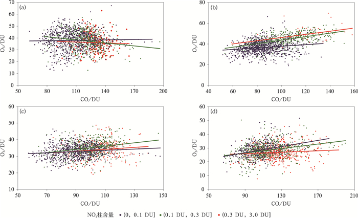 4.4 不同污染状况下的相关性分析O3与NO2,CO和水汽的相关性部分反映了边界层气团对O3总量的影响程度,同时也反映出不同时空范围内示踪物对O3影响的特征及差异。因此,以对流层NO2柱含量(0, 0.1 DU], (0.1 DU, 0.3 DU], (0.3 DU, 3.0 DU]为阈值分别代表重污染、轻污染、背景3种情况,探讨不同情况下O3分别与CO、水汽的相关性。
