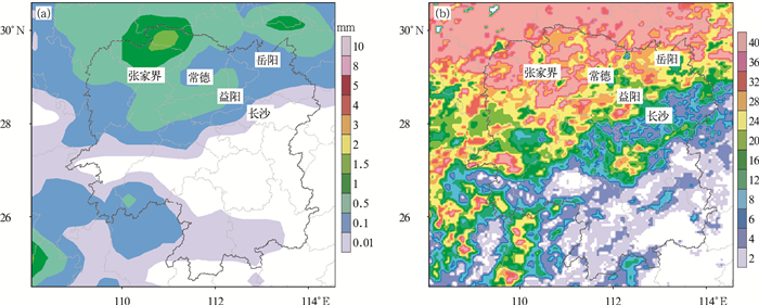 4.2.2 目标区云降水演变 4.2.2.1 地面降雨量湖南省中小尺度气象站网的降雨量统计(图略)显示飞机增雨对沅陵县上空的浓积云进行动力催化1 h后, 作业影响区和下风方向的降水量(0.1~3.1 mm)明显比上风方(0.3 mm以内)要大。