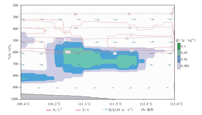 | 图2 GRAPES_CAMS模式预报2015年9月18日11:00沿29.18°N纬向的水成物垂直剖面 (Qc表示云水含量, Ni表示冰晶数浓度, T表示等温线) Fig.2 Vertical cross section of GRAPES_CAMS model predicted hydrometers along 29.18°N at 1100 BT 18 Sep 2015 (Qc:amount of cloud water, Ni:number concentration of ice, T:temperature) | |