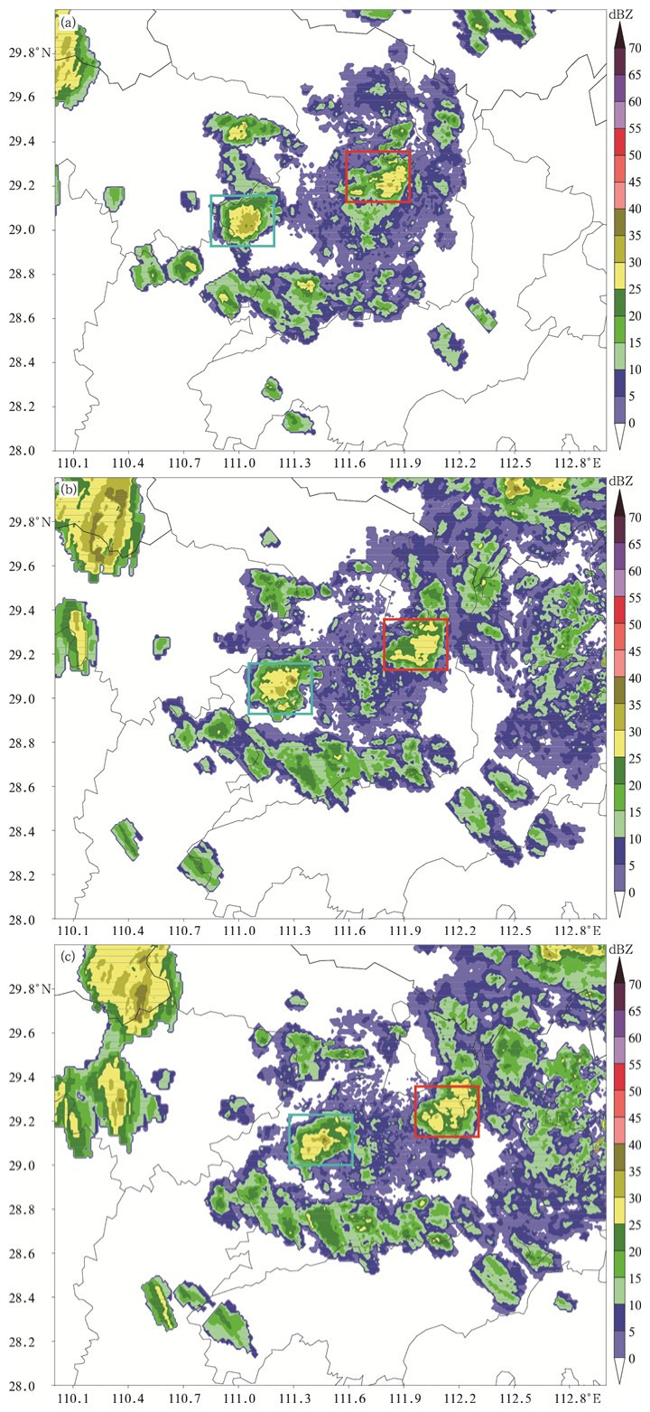 | 图4 2015年9月18日目标云(红色框)与对比云(蓝色框)的雷达回波组合反射率因子移动演变 (a)11:35, (b)12:00, (c)12:18 Fig.4 Movement changes in radar echo of seeded clouds(the red box) and contrast clouds(the blue box) (a)1135 BT, (b)1200 BT, (c)1218 BT | |