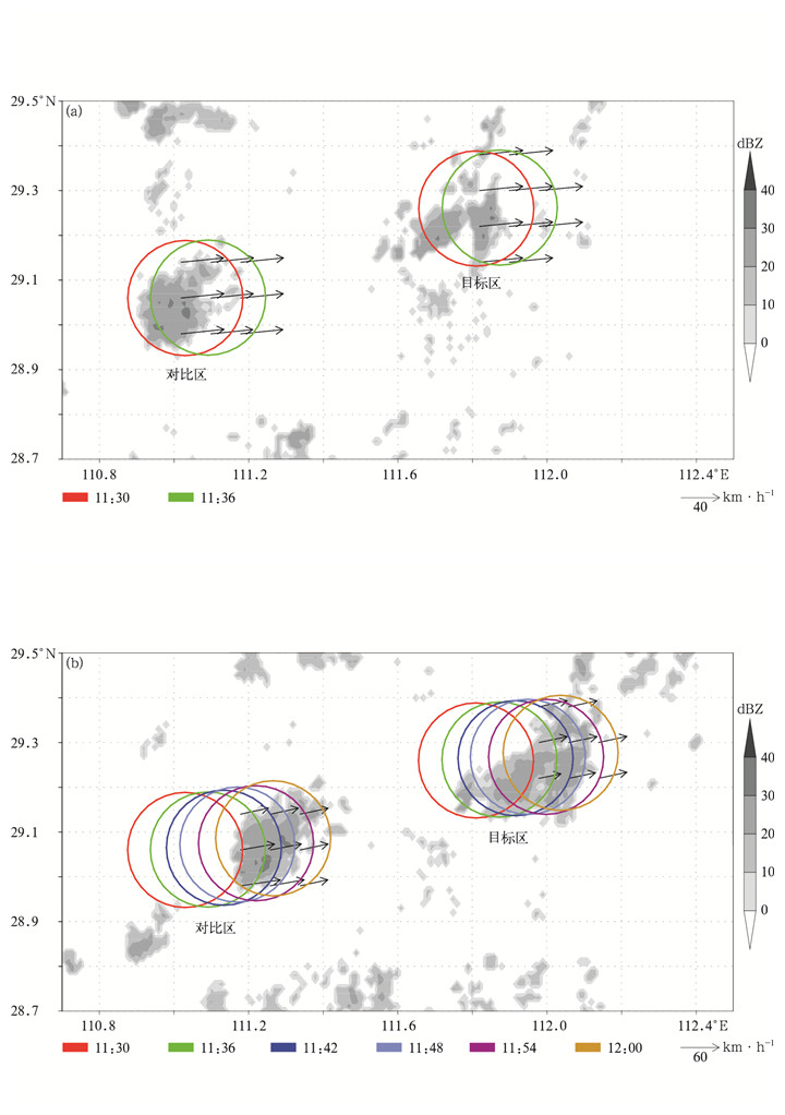 | 图5 2015年9月18日飞机增雨作业目标区和对比区回波跟踪 (a)11:36, (b)12:00 Fig.5 Echo tracking of seeding area and contrast area of the aircraft precipitation enhancement operation on 18 Sep 2015 (a)1136 BT, (b)1200 BT | |