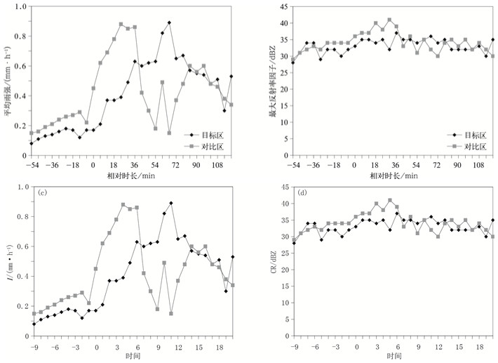 ③ 积云飞机增雨作业目标区与对比区的跟踪统计结果。将飞机绕飞作业后2 h目标区与对比区的雷达回波参数跟踪统计结果绘制成曲线图, 可以清楚地对比和了解作业后云的发展动态, 为便于了解自然云的发展趋势, 将作业前1 h的跟踪结果一并标出, 如图 6所示。图 6中横坐标表示相对于跟踪开始时刻的时长, 负号表示跟踪开始前。由图 6可以看到, 垂直积分液态含水量平均值作业前1 h目标区与对比区有相同的发展趋势, 均表现为逐步增强; 作业后目标区表现为持续增强→减弱, 而对比区表现为增强→减弱→增强→减弱。最大回波顶高作业前1 h目标区与对比区均表现为升高并基本维持; 作业后目标区表现为增高→减弱, 而对比区表现为减弱→缓增→减弱, 二者最后均维持在7~8 km高度。对于平均雨强, 目标区与对比区的变化趋势类似垂直积分液态含水量平均值。对于最大反射率因子, 作业前1 h目标区与对比区有相同的发展趋势, 均表现为缓慢增强并维持; 作业后目标区表现为稍增强并维持, 而对比区表现为稍增强再减弱, 二者最后均维持在30~35 dBZ强度。综上所述, 作业前1 h, 目标区和对比区云系的雷达回波参数垂直积分液态含水量、最大回波顶高、平均雨强、最大反射率因子有相同的发展趋势, 均表现为逐步增加或维持; 作业后2 h, 各参数在目标区呈单峰型增大趋势, 在对比区内各参数主要呈双峰型减弱趋势, 即增强→减弱→增强→减弱; 主要差别出现在作业后30~90 min时间段, 之后二者变化又渐趋于一致。跟踪统计结果表明:积云飞机增雨作业后, 目标区云体发展, 强度增强, 高度增加, 降水增大; 目标区相对对比区的积云发展, 各物理量的增强趋势更加明显、维持时间更长, 表明增雨作业有效。