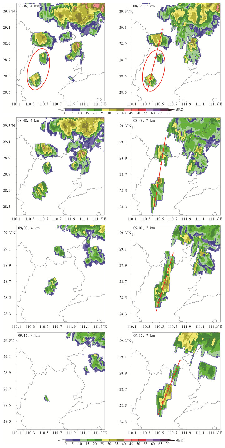 | 图7 2011年9月8日沅陵地区浓积云动力催化作业前后雷达回波变化 (红色线为剖面位置, 红色圈为播撒飞行轨迹) Fig.7 Radar echo changes before and after dynamical seeding operation with cumulus congestus at Yuanling on 8 Sep 2011 (the red line is sectional position, the red circle is flight track of seeding) | |