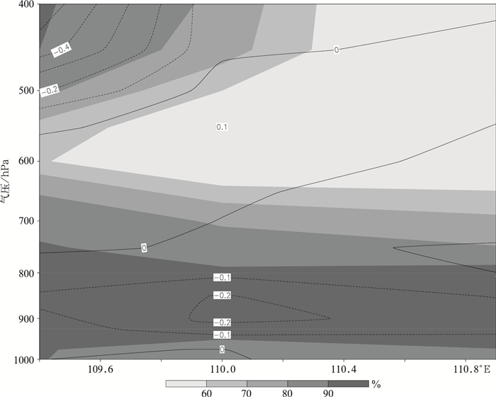 | 图8 2011年9月8日08:00沿28.45°N的垂直速度(等值线, 单位:Pa·s-1)和相对湿度(阴影)垂直剖面 Fig.8 The vertical section of vertical velocity(the contour, unit:Pa·s-1) and relative humidity(the shaded) along 28.45°N at 0800 BT 8 Sep 2011 | |