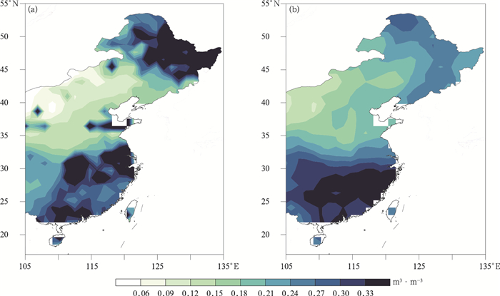 | 图1 2008—2013年5—6月平均表层土壤湿度分布(a)OF试验,(b)NMIC再分析资料 Fig.1 Distributions of mean soil moisture at ground surface averaged from May to Jun in 2008-2013 (a)OF experiment, (b)NMIC reanalysis data | |