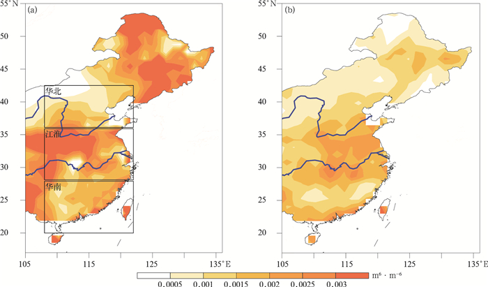 中国东部地区降水由北向南递增,对应的土壤湿度也存在北干南湿的分布特征,且在江淮流域的变率较强,在华北、华南地区的变率较弱。根据降水和土壤湿度特性的地域差异,将中国东部区域划分为华北地区(36°~42.5°N,108°~122°E)、江淮地区(28°~36°N, 108°~122°E)和华南地区(20°~28°N, 108°~122°E)进行逐一对比(具体分区范围见图 2a)。