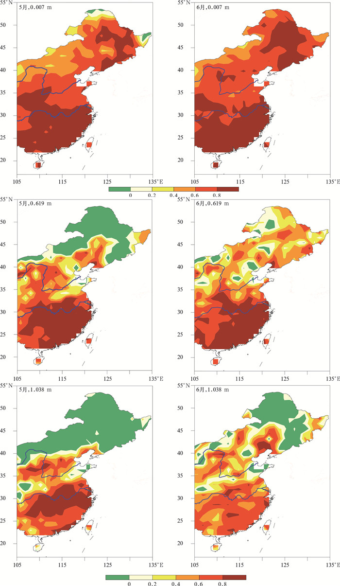 | 图3 OF试验所模拟的2008—2013年5—6月逐日不同深度的土壤湿度与同期NMIC再分析资料相关分布 Fig.3 Correlations of daily soil moisture between OF experiment and NMIC reanalysis data from May to Jun in 2008-2013 | |