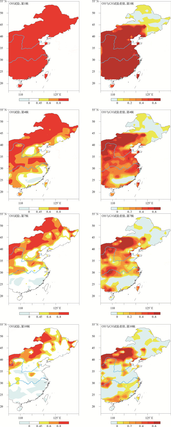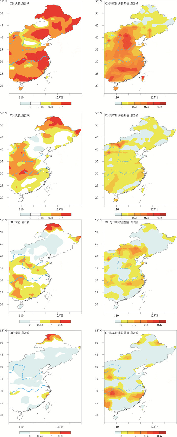 通过OH试验、CH试验结果与观测替代资料的相关系数的差值空间分布图可以清楚地看到,第1候,OH试验的相关系数明显高于CH试验,二者在东部地区差值超过0.2,在长江以南和华北地区最大可达0.4以上;第2~第3候,两组试验相关系数差值低于0.1;第4候,除长江以南地区外,其余地区OH试验模拟结果的相关系数均低于CH试验结果。即模式中表层土壤湿度初值的影响时间可持续3候左右;在3候以后,基于真实初值的预报和基于气候态初值的预报无太大差别。
