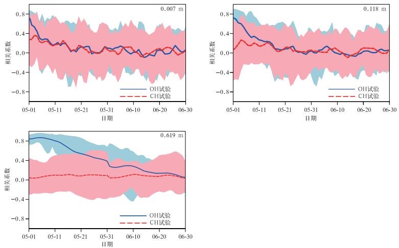 | 图6 OH和CH试验预报的中国东部地区土壤湿度和观测替代数据相关系数(曲线表示1994—2013年平均的土壤湿度相关系数,阴影部分表示相关系数变化范围) Fig.6 The variation of pattern correlations of soil moisture of OH experiment, CH experiment to observation in the eastern China(lines denote correlations of soil moisture during 1994-2013, shaded areas denote range of correlations) | |