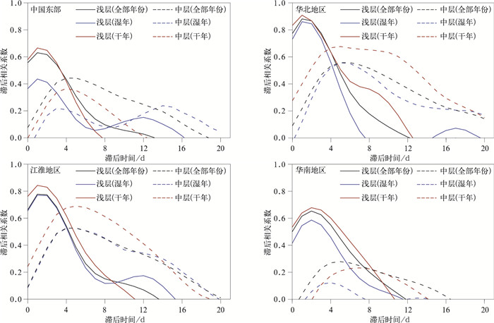 本文对OH试验中国东部地区干年和湿年平均降水及对应的土壤湿度进行标准化,发现在预报开始时,降水变化要超前于土壤湿度变化(图略)。为了进一步研究这种滞后关系将OH试验中的降水与浅层和中层的土壤湿度分别求滞后相关(图 7),在几个区域内,浅层土壤湿度与降水在滞后时间为1~2 d时滞后相关系数最大,可达到0.7~0.9;而中层土壤湿度与降水之间的滞后相关在5~6 d左右达到最大,这可能是因为降水到达地面后通过自上而下的渗透先后影响表层、中层、深层的土壤含水量而造成的。降水和土壤湿度的滞后关系也存在一定的区域差异,其中华北地区的滞后相关系数较高,华南地区的相关系数较低,表明在降水偏少地区土壤湿度对降水响应更加敏感;同时,降水和土壤湿度的滞后相关系数在干年也高于湿年,这说明前期降水量偏少的情况下后期土壤湿度与降水的联系可能更加紧密。