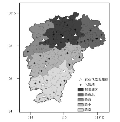 | 图1 江西省早稻种植区划分、气象站和农业气象观测站分布 Fig.1 Distribution of rice-growing subareas with meteorological and agrometeorological stations in Jiangxi Province | |
