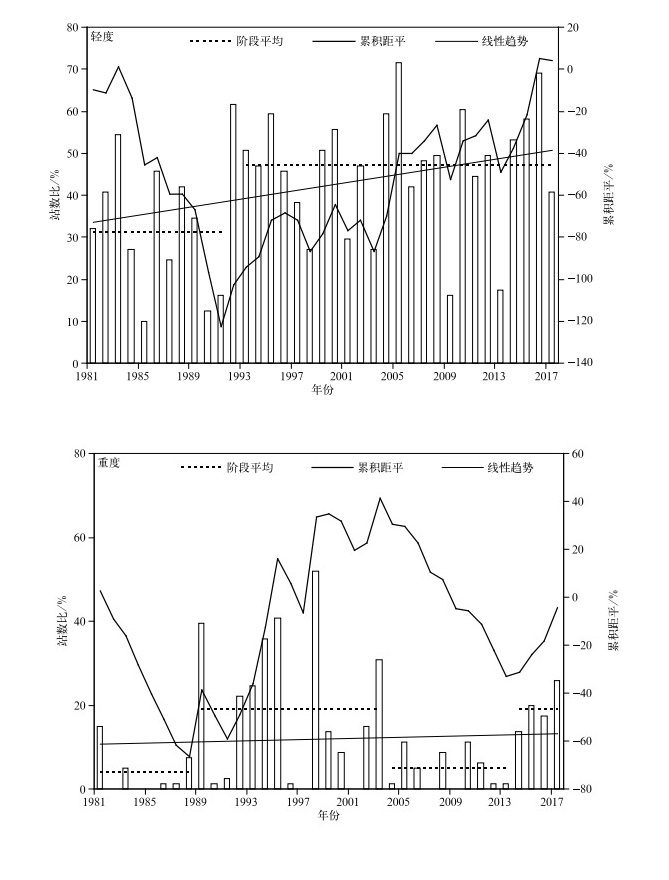 2 结果与分析 2.1 雨洗花灾害时空变化 2.1.1 年际变化对1981—2017年江西省早稻雨洗花灾害发生站数比进行统计可知,江西省早稻雨洗花灾害发生范围广,多年平均站数比达54%,其中轻度灾害影响范围明显大于重度。图 2为1981—2017年江西省早稻轻度、重度雨洗花灾害发生站数比的年际变化。由图 2可以看到,江西省早稻轻度雨洗花灾害站数比呈增加趋势,但未达到0.01显著性水平;重度灾害站数比线性变化趋势不明显。从累积距平曲线看,江西省早稻轻度雨洗花灾害站数比累积距平曲线呈Ⅴ型变化,1991年以前基本呈下降趋势,之后阶梯式上升,其中1981—1991年轻度灾害发生平均站数比为31%,而1992—2017年平均站数比上升至47%,前后两阶段站数比均值差异的t检验达0.01显著性水平;重度雨洗花灾害站数比累积距平曲线呈W型变化,1989—2003年和2014—2017年为重度雨洗花灾害主要发生时期,期间平均站数比为19%,而1981—1988年和2004—2013年为重度雨洗花灾害低发期,多数年份站数比低于5%。由此可知,早稻轻度雨洗花灾害持续影响江西省大部分地区,尤其是自1992年以来,其影响范围明显扩大;而重度雨洗花灾害主要影响局部地区,且有明显的活跃期和低发期。