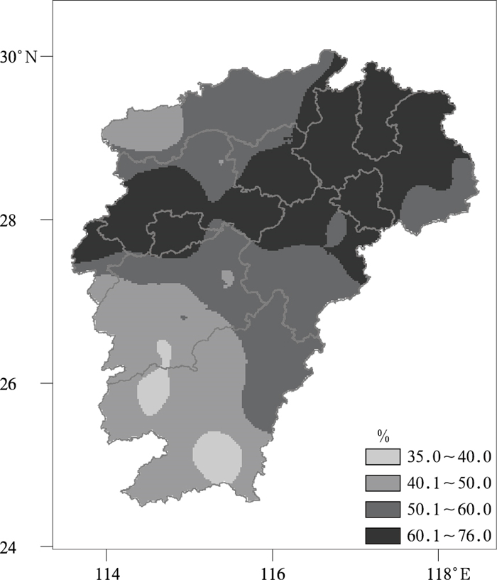| 图3 1981—2017年江西省早稻雨洗花灾害发生频率的空间分布 Fig.3 The occurrence frequency of rain- washing damage to early rice pollen in Jiangxi Province from 1981 to 2017 | |