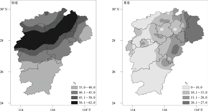 | 图4 1981—2017年江西省早稻轻度、重度雨洗花灾害发生频率的空间分布 Fig.4 The occurrence frequency of light, severe rain-washing damages to early rice pollen in Jiangxi Province from 1981 to 2017 | |