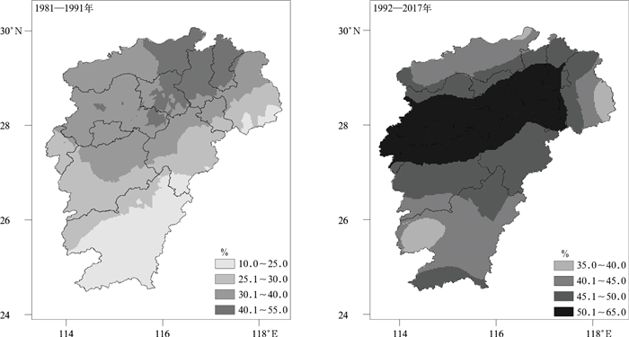为进一步分析江西省早稻雨洗花灾害发生频率的空间变化,分时段统计了江西省早稻轻度、重度雨洗花灾害发生频率的空间分布,结果分别见图 5、图 6。由图 5可以看到,1981—1991年江西省早稻轻度雨洗花灾害发生频率整体偏低,江西全省大部分地区轻度灾害发生频率在40%以下,尤其是赣南地区发生频率不超过25%;其高值区集中在九江东部、南昌东部、上饶西部、景德镇等环鄱阳湖地区,发生频率为40.1%~55.0%。1992—2017年江西省早稻轻度雨洗花灾害发生频率整体上升,江西全省大部分地区轻度灾害发生频率超40%;其高值区南移到赣北南部、赣中北部、上饶西部和鹰潭等地,发生频率为50.1%~65.0%。