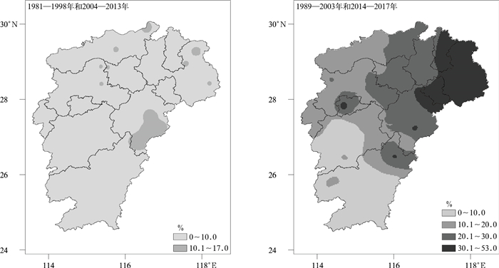 由图 6可以看到,1981—1988年和2004—2013年江西省早稻重度雨洗花灾害发生频率小,期间有50%站点未发生重度灾害,发生频率超10%的站点仅占14%,离散分布在赣北和赣中局部地区。1989—2003年和2014—2017年江西省早稻重度雨洗花灾害发生频率有所上升,高值区集中在赣东北,发生频率为30.1%~53.0%;其次为鄱阳湖区和赣中东部,发生频率为20.1%~30.0%;低值区主要分布在赣南和吉安西南部,发生频率为0~10.0%。