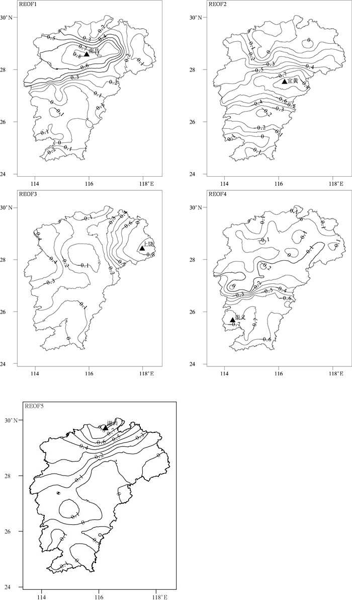 | 图7 江西省早稻雨洗花灾害REOF分解的前5个空间模态 Fig.7 The first five modes of rain-washing damage to early rice pollen in Jiangxi Province by REOF analysis | |