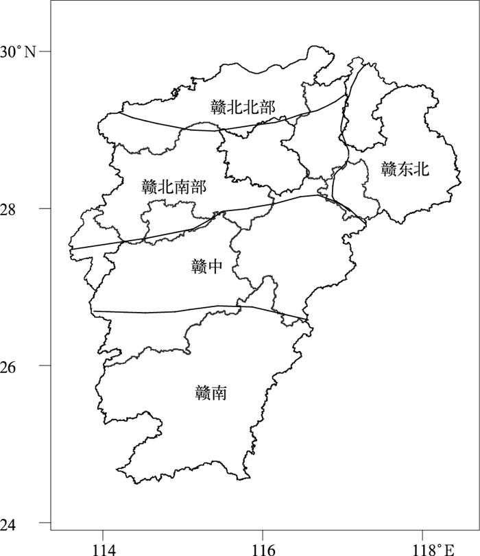 由图 7可以看到,各空间模态高载荷只集中分布在某一区域上,集中区内各站点雨洗花灾害变化具有一致性,可以较好地代表对应区域雨洗花灾害的典型特征,其中REOF1的高载荷区(绝对值不小于0.5,下同)位于赣北南部,主要包括萍乡北部、宜春、新余、南昌和上饶西部,代表站为南昌站,中心载荷0.805;REOF2的高载荷区位于赣中地区,包括抚州和吉安除西南部以外的大部分地区,代表站为宜黄站,中心载荷-0.902;REOF3的高载荷区位于赣东北,主要包括上饶东部、景德镇和鹰潭地区,代表站为上饶站,中心载荷-0.847;REOF4的高载荷区主要位于赣南,包括赣州和吉安西南部,代表站为崇义站,中心载荷-0.793;REOF5的高载荷区位于赣北北部,包括九江市除西南部以外的大部分地区,代表站为湖口站,中心载荷0.866。根据上述高载荷区域范围,可将江西省早稻雨洗花灾害划分为赣北南部、赣中、赣东北、赣南和赣北北部5个区域(图 8),这5个区域覆盖了江西省绝大部分区域,几乎没有重复,说明分区方法客观可行。